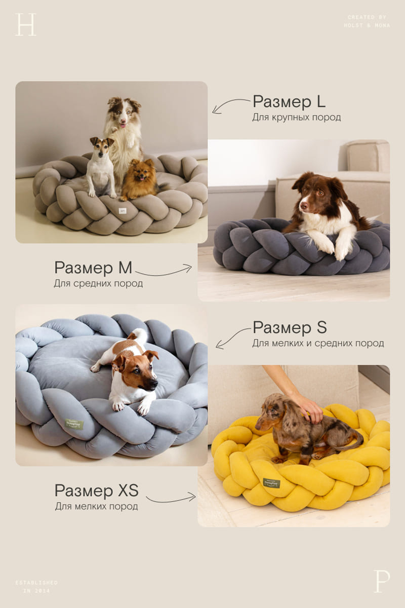 | Размеры | M: 100×92×22 см, L: 128×115×29 см, S: 85×75×21 см, XS: 70×60×16 см |