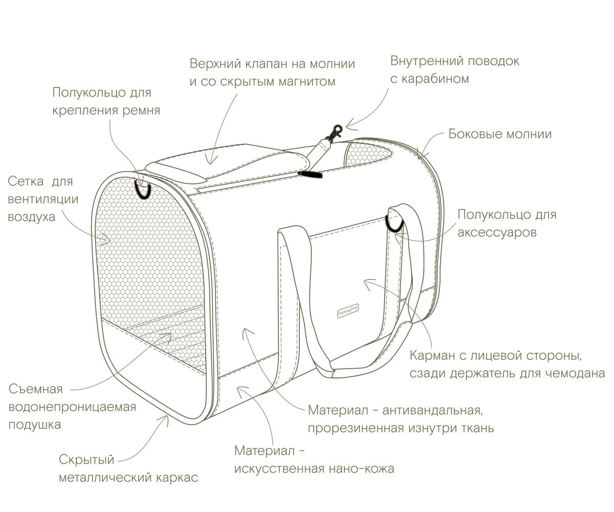 Внутри сумки предусмотрен ремешок для безопасной фиксации вашего питомца. Два вентилируемых окна обеспечивают достаточное поступление воздуха, а верхняя крышка на молнии с магнитом обеспечивает удобный доступ к животному.