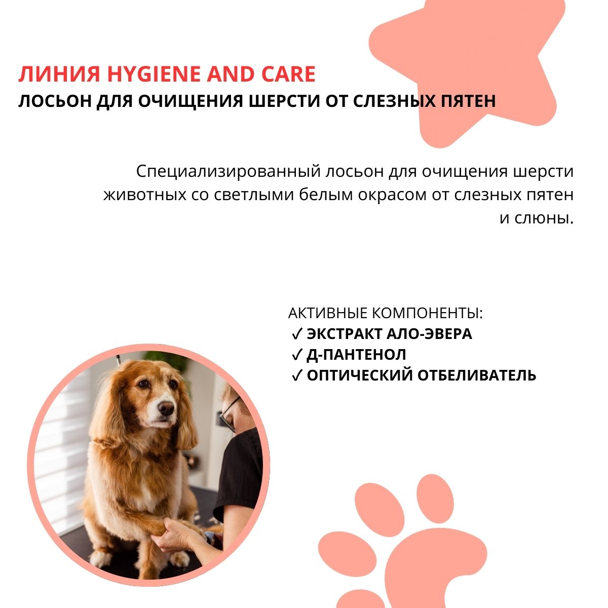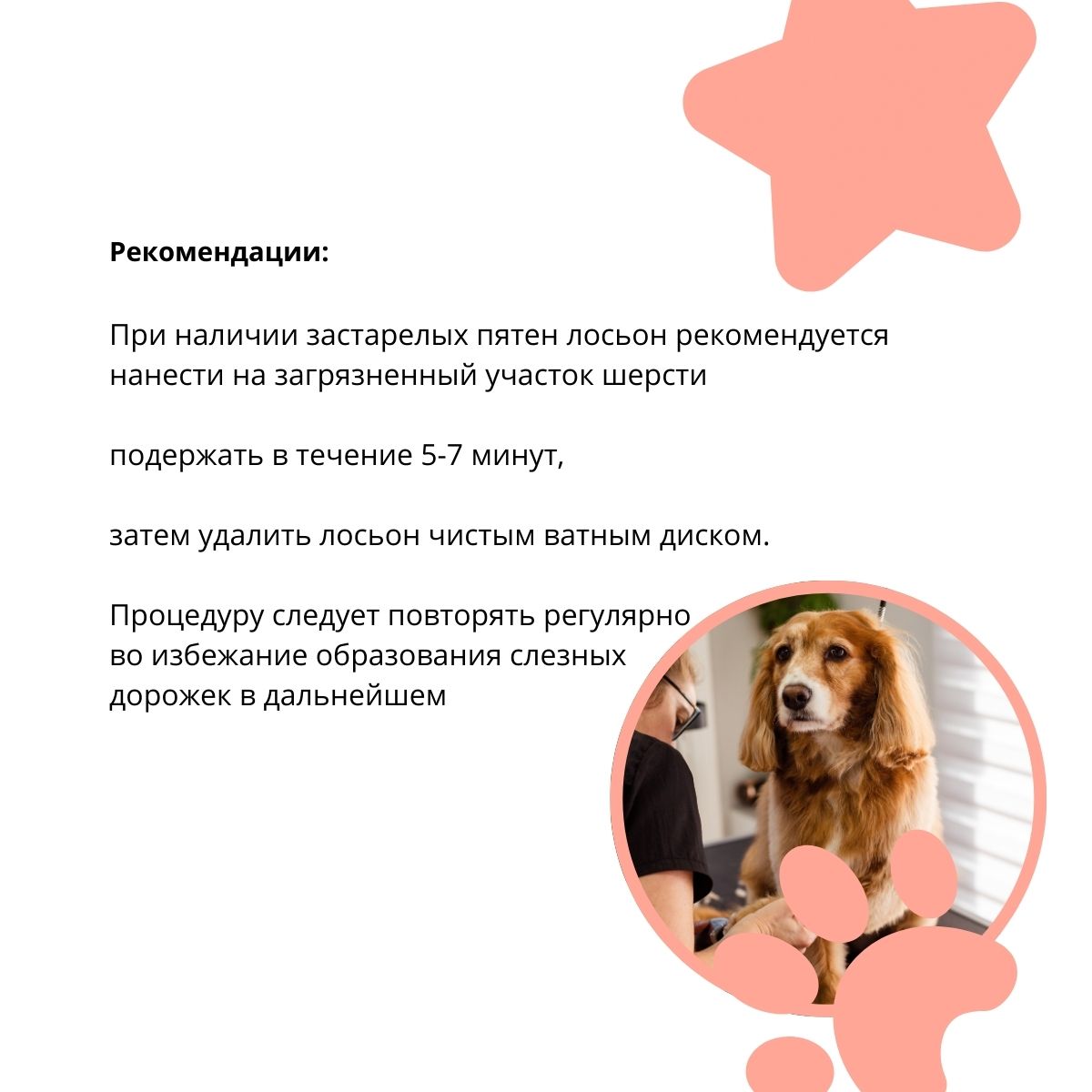 | Особенности | Мягко очищает шерсть вокруг глаз и пасти от загрязнений, Удаление пятен от слёз и слюны у собак |
