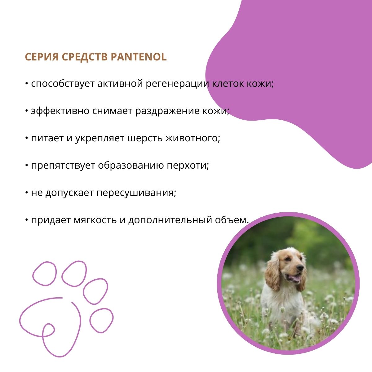 Облегчает расчесывание, Оказывает заживляющее и противовоспалительное действие, Подходит для ежедневного использования, Помогает ревитализировать (восстанавливать) шерстный покров, Устраняет зуд и раздражения на коже собаки