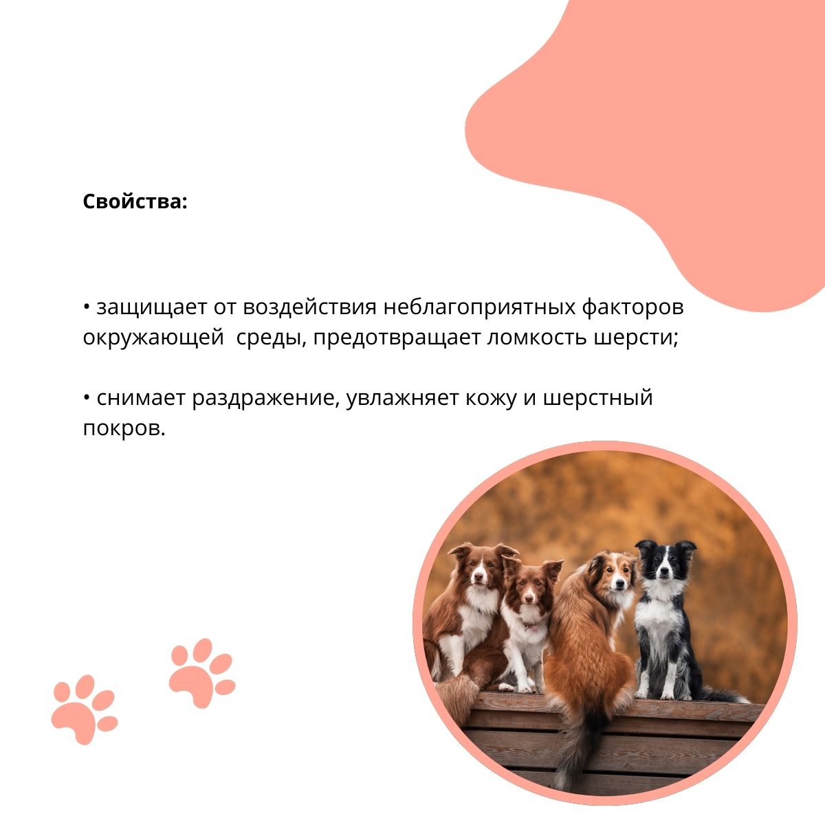 Облегчает расчесывание, устраняет статику, Оказывает заживляющее и противовоспалительное действие, Придает блеск и шелковистость, Придаёт объём шерсти, Распутывает колтуны на шерсти питомца